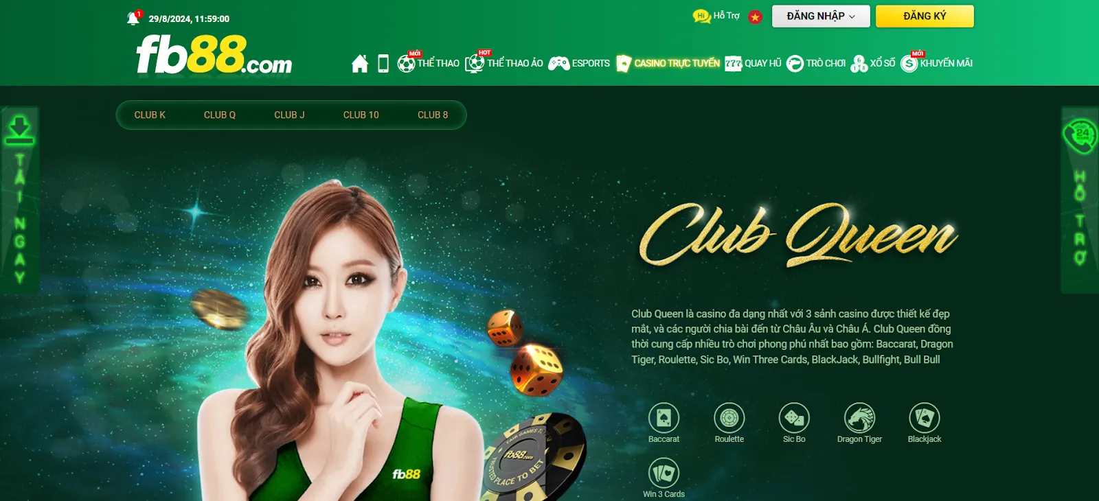 Chuyên mục casino được đặc biệt ưu ái khi sở hữu tới 5 sảnh cược khác nhau được đặt tên là Club K, Club Q, Club J, Club 10 và Club 8, lấy cảm hứng từ các lá bài Tây có trong bộ bài. Các tựa game hot hit nhất hiện nay có tại sân chơi là roulette, sicbo, blackjack, baccarat,… Mỗi trò đều sẽ có những thiết kế giao diện riêng cùng các kèo cược phong phú, đa dạng, tạo nên một trải nghiệm mới lạ và thú vị cho các game thủ.